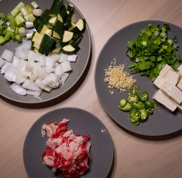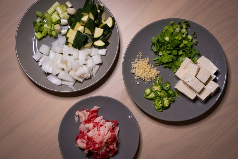 Prepare all vegetables by cutting them into neat, bite-sized rectangular pieces. Set aside each ingredient so it's ready for smooth assembly during cooking.