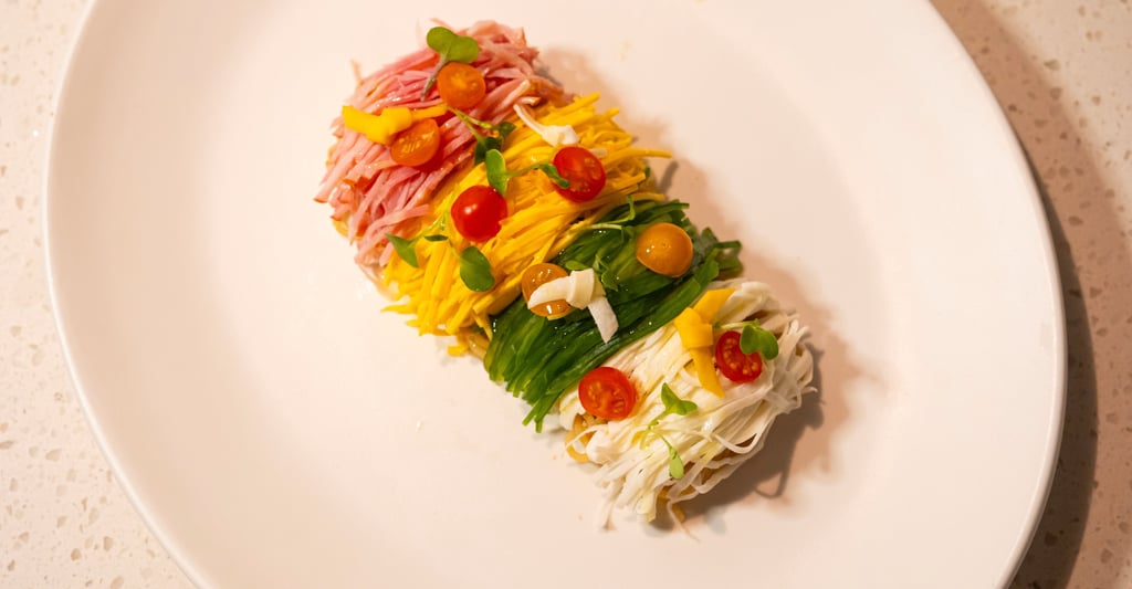 Plate and Garnish: Mound the noodles on a plate. Neatly top with sliced egg, ham, cucumber, and tomatoes. Garnish with reserved egg ribbons and chilled microgreens.