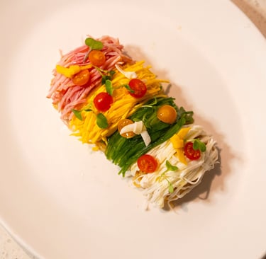 Slice the Toppings: Julienne the ham and cucumber into very thin strips. Halve the cherry tomatoes. Keep the microgreens chilled until ready to serve.